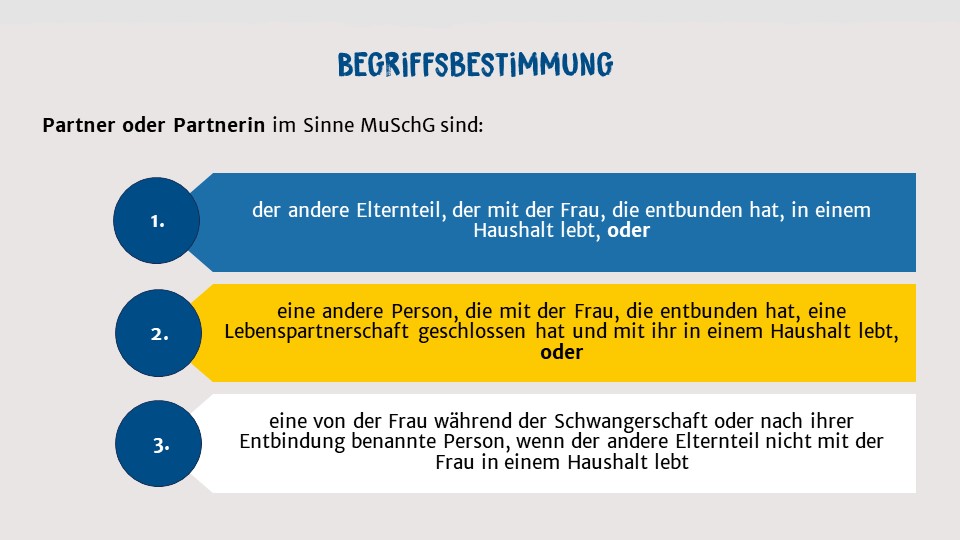 Die Definition, wer als Partner oder Partnerin i. S. MuSchG gilt, gliedert sich in drei Alternativen, die sich gegenseitig ausschließen (Verknüpfung mit „oder“).
