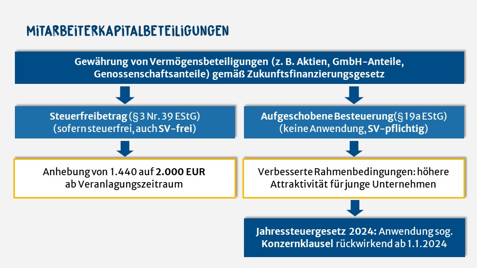 Das Gesetz zur Finanzierung von zukunftssichernden Investitionen (Zukunftsfinanzierungsgesetz – ZuFinG) wurde am 14. Dezember 2023 im Bundesgesetzblatt veröffentlicht. Neben finanzmarktrechtlichen Anpassungen und der Fortentwicklung des Gesellschaftsrechts sind auch steuerrechtliche Rahmenbedingungen für Mitarbeiterkapitalbeteiligungen (im Einkommensteuergesetz als „Vermögensbeteiligungen“ bezeichnet) verbessert worden.