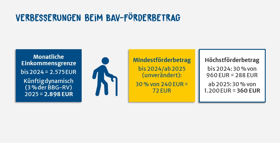 Als zusätzlicher Anreiz für den Aufbau einer arbeitgeberfinanzierten betrieblichen Altersversorgung bei Geringverdienern ist der BAV-Förderbetrag mit dem sog. Grundrentengesetz ab dem Jahr 2020 von max. 144 EUR auf max. 288 EUR verdoppelt worden; förderfähig sind also seither zusätzliche Arbeitgeberbeiträge bis zu höchstens 960 EUR (30 % von 960 EUR = 288 EUR).