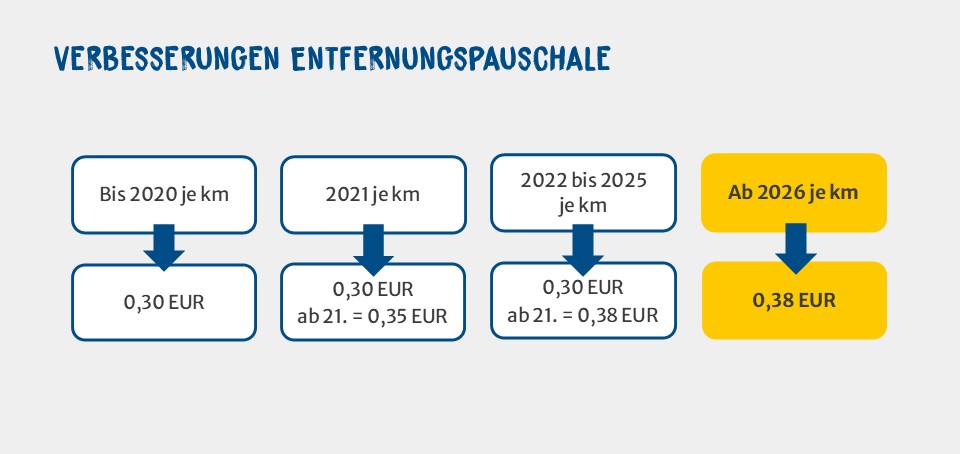 Mit dem Steueränderungsgesetz 2025 ist dieser Plan nun in die Tat umgesetzt und die Entfernungspauschale zum 1. Januar 2026 einheitlich auf 38 Cent ab dem ersten gefahrenen Kilometer erhöht worden; bisher galt dieser Betrag erst ab dem 21. Kilometer. Das Bundeskabinett hat das Steueränderungsgesetz 2025 am 10. September 2025 beschlossen, der Bundestag hat es am 4. Dezember 2025 in 2./3. Lesung verabschiedet und der Bundesrat hat am 19. Dezember 2025 zugestimmt. Die Veröffentlichung im Bundesgesetzblatt erfolgte am 23. Dezember 2025 (Nummer 363).