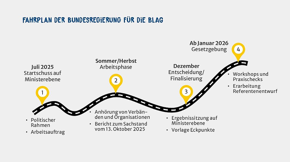 In einer gemeinsamen Sitzung hat sich am 7. Juli 2025 die Bund-Länder-Arbeitsgruppe (BLAG) in Berlin konstituiert und sich auf das weitere Vorgehen für eine Reform der Pflegeversicherung verständigt. Am 11. Dezember 2025 legte die Arbeitsgruppe „Zukunftspakt Pflege“ ihre fachlichen Eckpunkte vor, die im kommenden Jahr in ein Gesetzgebungsverfahren einfließen und in einem Gesetz für eine nachhaltige Pflegestruktur- und -finanzierungsreform münden sollen. In der Roadmap des Bundesgesundheitsministeriums heißt es, dass das Gesetz "möglichst Ende 2026 in Kraft treten" soll. Alle Maßnahmen stehen dabei laut Koalitionsvertrag unter Finanzierungsvorbehalt.