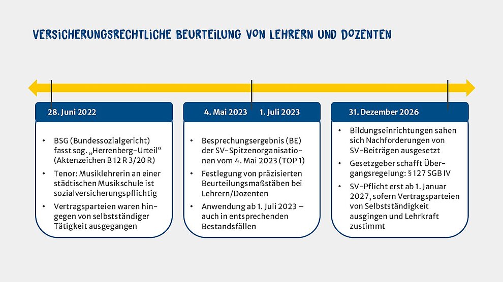 Nach der Übergangsregelung in § 127 SGB IV soll eine Feststellung des Sozialversicherungsstatus von Lehrkräften als abhängig beschäftigt durch die Sozialversicherungsträger bis zum 31. Dezember 2026 ohne Wirkung bleiben; d. h. die Versicherungspflicht soll erst ab dem 1. Januar 2027 beginnen. Dies gilt immer dann, wenn