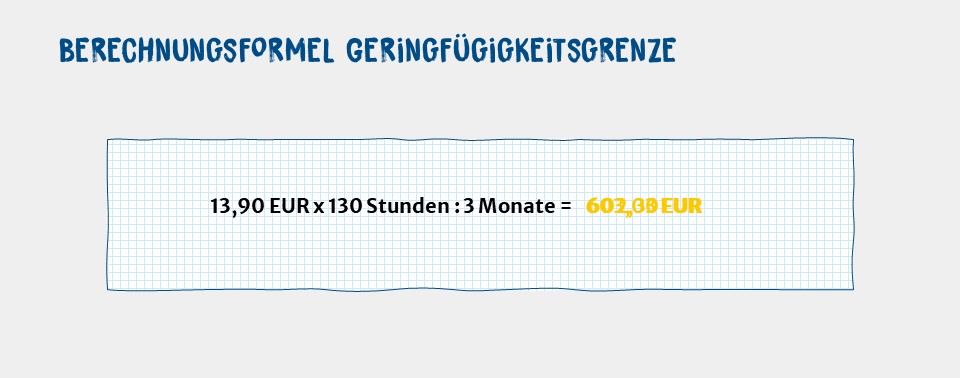 Berechnung: Als dynamische Obergrenze für einen Minijob orientiert sich die Geringfügigkeitsgrenze an einer Wochenarbeitszeit von 10 Stunden zum gesetzlichen Mindestlohn. Der gesetzliche Mindest-Stundenlohn wird mit 130 Stunden (13 Wochen pro Quartal multipliziert mit 10 Stunden) vervielfacht, durch 3 Monate geteilt und der sich daraus ergebende Betrag wird auf volle Euro aufgerundet. Eine wöchentliche Arbeitszeit von 10 Stunden entspricht einer Arbeitszeit von 43 Stunden und 20 Minuten im Monat.